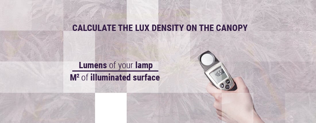 Για να πάρετε μια ιδέα για την ένταση του φωτός που παρέχετε στα φυτά σας, μπορείτε να αγοράσετε έναν μετρητή lux και να μετρήσετε την ένταση του φωτός σε διαφορετικά σημεία του θόλου. Εναλλακτικά, μπορείτε να κάνετε έναν θεωρητικό υπολογισμό που λαμβάνει υπόψη τα lumen που εκπέμπονται από τον λαμπτήρα σε σχέση με την επιφάνεια της καλλιέργειας. Για να υπολογίσετε την πίεση lux στον θόλο, απλώς διαιρέστε τα lumen του λαμπτήρα σας με τα τετραγωνικά μέτρα της φωτιζόμενης επιφάνειας. Εάν τοποθετήσετε έναν λαμπτήρα που παράγει 100.000lm σε απόσταση 1m από την κορυφή του φυτού, θα φωτίζει μια έκταση 1m² με ένταση 100,000lx (100,000lm ÷ 1m = 100,000lx). Εάν ο λαμπτήρας έχει τοποθετηθεί σε απόσταση 0.5m, θα λάβει 100,000lm ÷ 0.5m = 200,000lx.